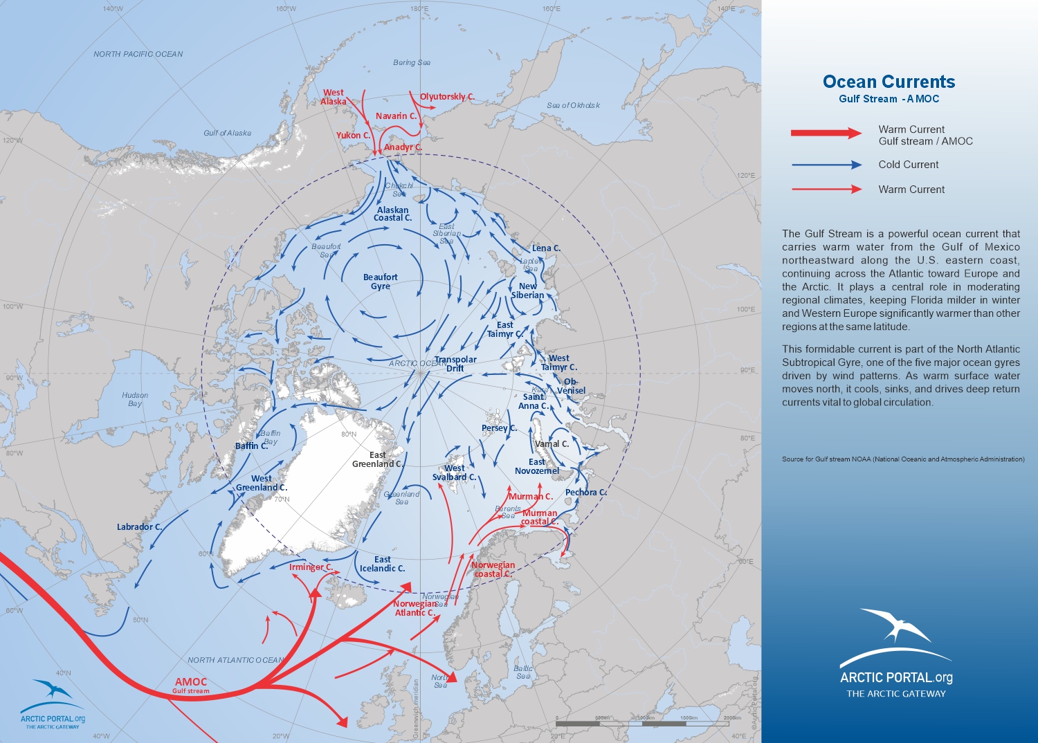 Arctic Portal Map: Gulfstream AMOCOften described as a vast ocean “conveyor belt,” the AMOC is a system of currents that moves warm surface water from the tropics northward and returns colder, deeper water southward. This continuous loop redistributes heat, salt, and nutrients across the Atlantic and beyond, playing a crucial role in regulating global climate.
