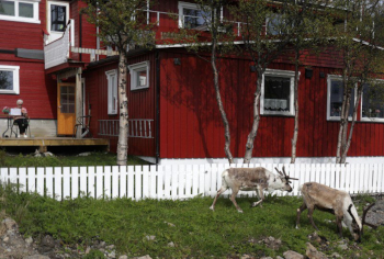 “The reindeer are annoying … They eat all the flowers I plant,” said Karin Karlsen, 78, knitting on her patio while reindeer nibbled at the grass behind her red