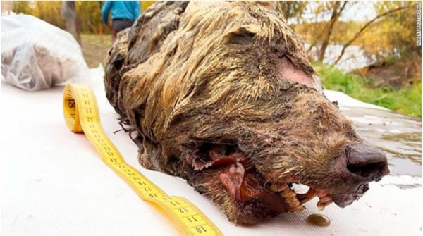 Remains of a 40 000 year old severed wolf´s head found on the banks of Tirekhtyakh River in Yakutia the Republic of Sakha, Russia. According to CNN It has been preserved by permafrost complete with teeth and fur.