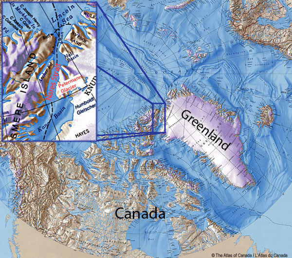 it can be estimated that this event was hastened by rising sea and air temperatures in the Arctic but perhaps not a direct consequence of the warming. In 1962 a 370 square kilometer iceberg broke of from the nearby Ward Hunt Ice Shelf.