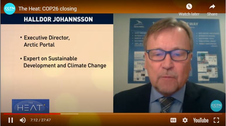Halldór Jóhannsson, the general director of Arctic Portal was in a panel interview on China Global Television Network (CGTN) Friday November 12 talking about the COP26. In the interview, he mentioned the importance of activating and educating young people on climate and environmental issues, how to reach out to policymakers, and the conversion of knowledge from science to policy as per the Arctic Risk Platform by the Arctic Basecampwhich the Arctic Portal team is a partner in.