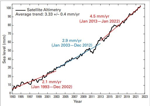 Global mean sea level reached a new record high in 2021, after increasing at an average 4.5 mm per year over the period 2013 -2021. This is more than double the rate of between 1993 and 2002 and is mainly due to the accelerated loss of ice mass from the ice sheets. This has major implications for hundreds of millions of coastal dwellers and increases vulnerability to tropical cyclones.