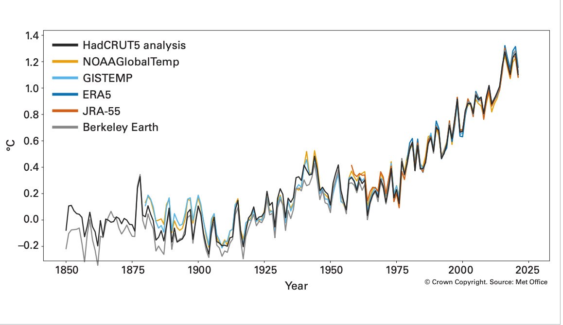 The global annual mean temperature in 2021 was around 1.11 ±0.13 °C above the 1850-1900 pre-industrial average, less warm than some recent years owing to cooling La Niña conditions at the start and end of the year. The most recent seven years, 2015 to 2021, are the seven warmest years on record.