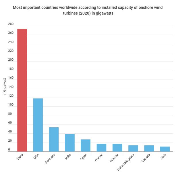 Comparing the most prominent countries in terms of installed capacity of wind turbines, China is already in undisputed first place – even without the giant park currently being planned in the Gobi Desert. In 2020, China generated 273 gigawatts with onshore wind turbines alone. The United States of America comes in second place with 118 gigawatts, followed by Germany with 54 gigawatts. Of the 10 largest manufacturers of onshore wind turbines (in terms of new installations), 7 are from China.