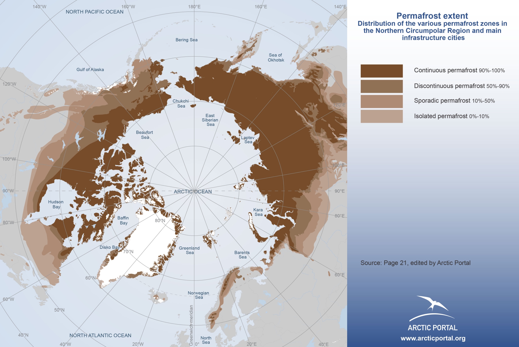 The accompanying map illustrates the extent of permafrost across the Arctic, highlighting regions where frozen ground persists year-round.