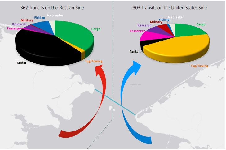Figures 1 (above) and 2 (to the side) were built by using the MMSI’s of vessels that posted a transit across the Bering Strait passageline at least once during the year. Vessels that stayed north or south of the Strait for the entire year are not displayed in these figures.
