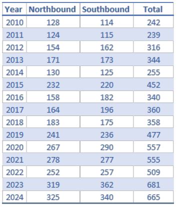 The report provides a summary of AIS equipped vessel transits in 2024 and makes comparisons to data gathered over the past decade.