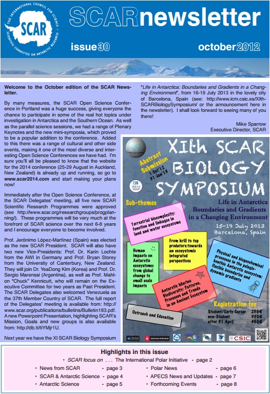 The latest issue of the SCAR newsletter is now available. SCAR is the Scientific Committee on Antarctic Research, an inter-disciplinary committee of the International Council for Science (ICSU).