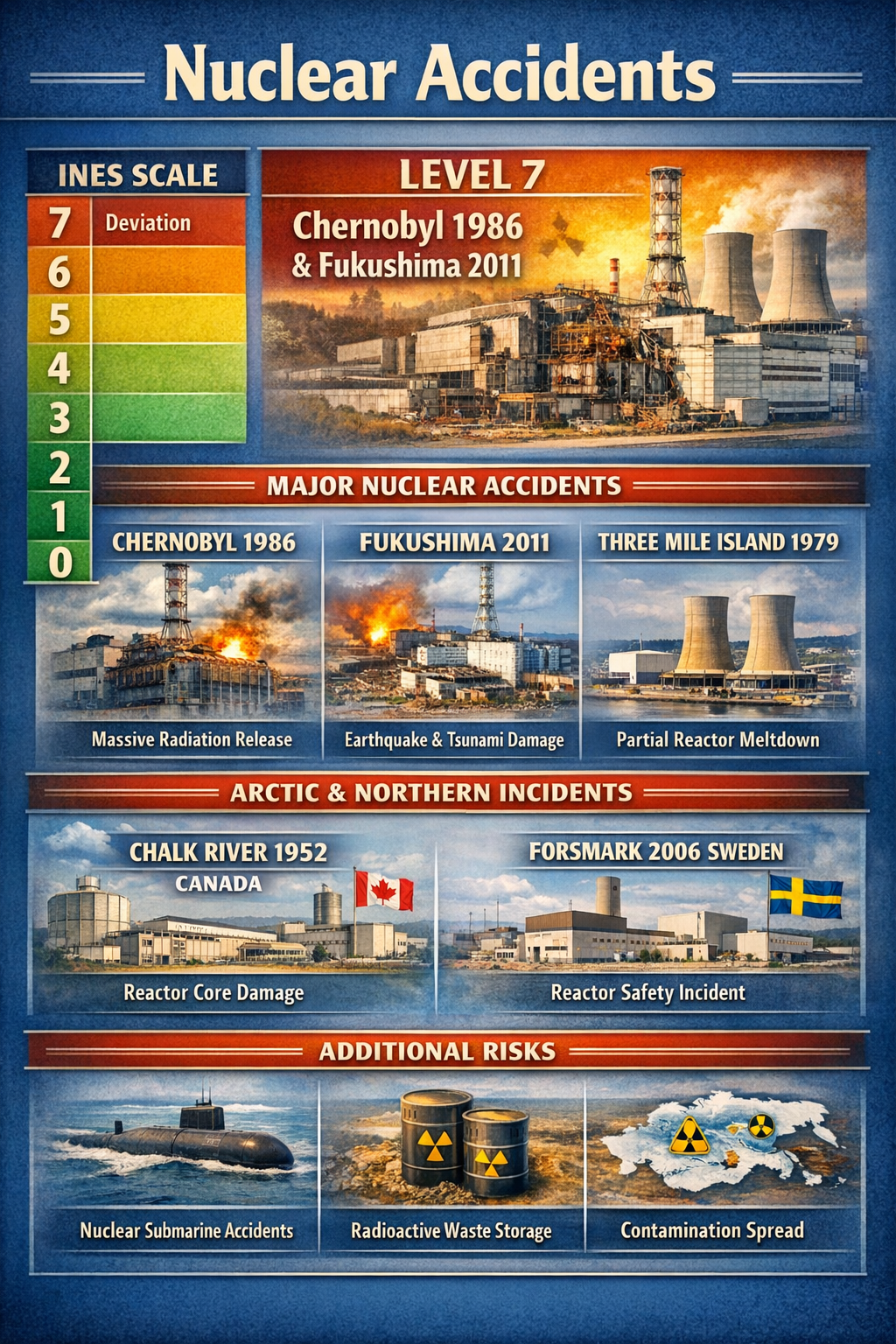 - Reactor meltdowns and radioactive release